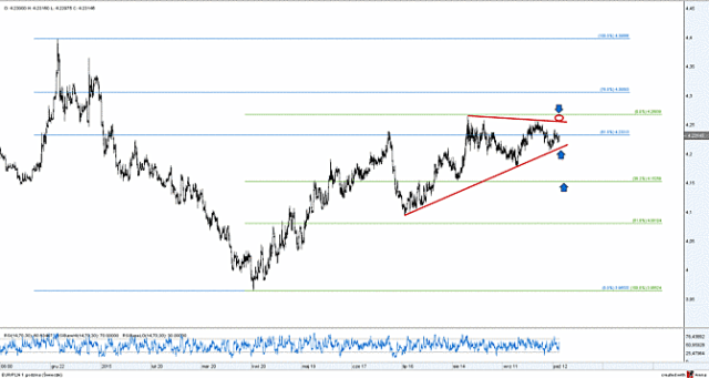 Ostatnie godziny na rynku EURPLN nie przyniosły żadnych zasadniczych rozstrzygnięć. Kurs tej pary kontynuuje ruch w ramach średnioterminowej konsolidacji, która przypomina trójkąt. Jako, że formacja ta była poprzedzona wyraźnym ruchem wzrostowym, to z większym prawdopodobieństwem można oczekiwać wybicia z niej górą. Aby doszło do realizacji takiego scenariusza, strona popytowa będzie musiała sobie poradzić z oporami rozciągającymi się pomiędzy 4,2560 a 4,2675 (patrz wykres powyżej). Ich ewentualne przebicie otworzyłoby drogę do zwyżki notowań analizowanej pary w okolice ograniczeń zlokalizowanych w rejonie 4,3050, gdzie znajduje się 78% zniesienie sekwencji spadkowej zainicjowanej na tym rynku pod koniec poprzedniego roku.
