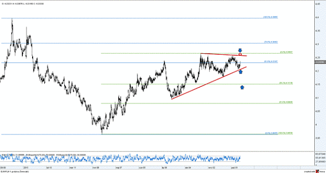 Zgodnie z oczekiwaniami (patrz wczorajszy komentarz popołudniowy) doszło do wyraźnego uaktywnienia się strony popytowej na wykresie EURPLN. Kurs tej pary odbił tym samym od dolnego ograniczenia średnioterminowej konsolidacji, które aktualnie przebiega na poziomie 4,2050. To z kolei otwiera drogę popytowi do ponownego przetestowania kluczowych oporów rozciągających się pomiędzy 4,2590 a 4,2660 (których geneza została przedstawiona na wykresie powyżej). Przebicie tych ograniczeń dałoby asumpt do umocnienia wspólnej waluty względem złotego co najmniej w okolice 4,3050, gdzie usytuowane jest 78% zniesienie sekwencji spadkowej ukształtowanej na tym rynku w okresie grudzień 2014 - kwiecień 2015. Taki wariant jest na obecnym etapie wariantem bazowym.