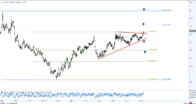 Do kluczowych rozstrzygnięć doszło na rynku EURPLN. Kurs tej pary sforsował istotne opory rozciągające się pomiędzy 4,2555 a 4,2665. Tym samym doszło do wybicia górą ze średnioterminowej konsolidacji, co było wariantem preferowanym na tych stronach w poprzednich komentarzach. W konsekwencji droga do dalszego umocnienia wspólnej waluty względem złotego została otwarta. Pierwszych potencjalnych zasięgów dla takiego scenariusza szukałbym w rejonie 4,3055, gdzie znajduje się 78% zniesienie sekwencji spadkowej zainicjowanej na tym rynku pod koniec poprzedniego roku. Przebicie tych barier dałoby asumpt do wywindowania kursu analizowanej pary nawet w okolice 4,40. Geneza wszystkich wymienionych poziomów została przedstawiona na wykresie powyżej.